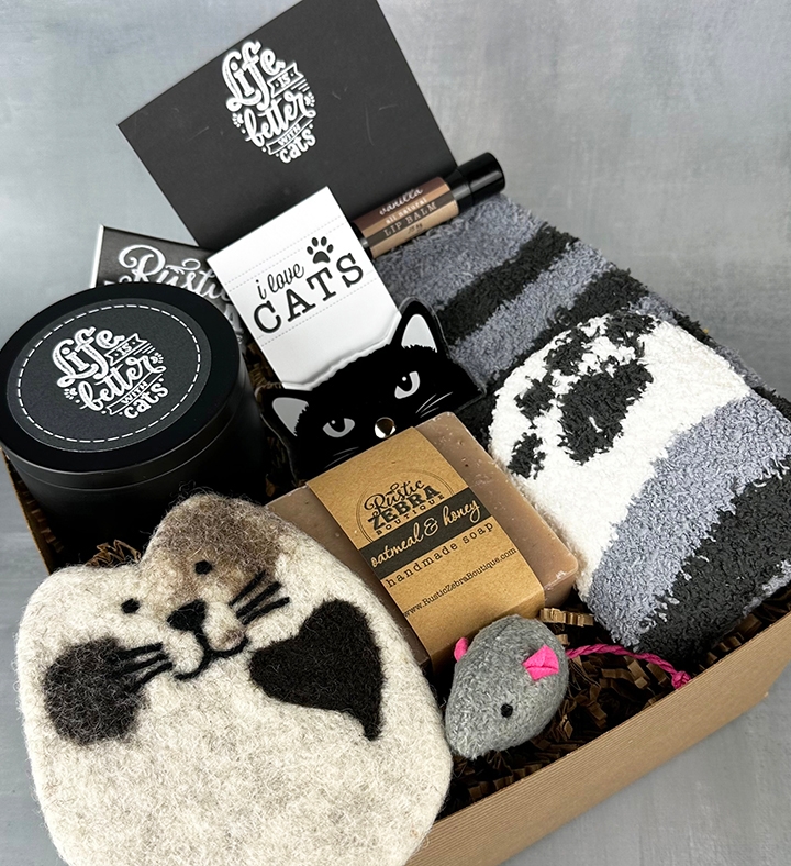 Honor the cat lover in your life with a lovely soy birch scented candle, cat clip frame, vanilla lip balm, cat socks, cat toys, and more!