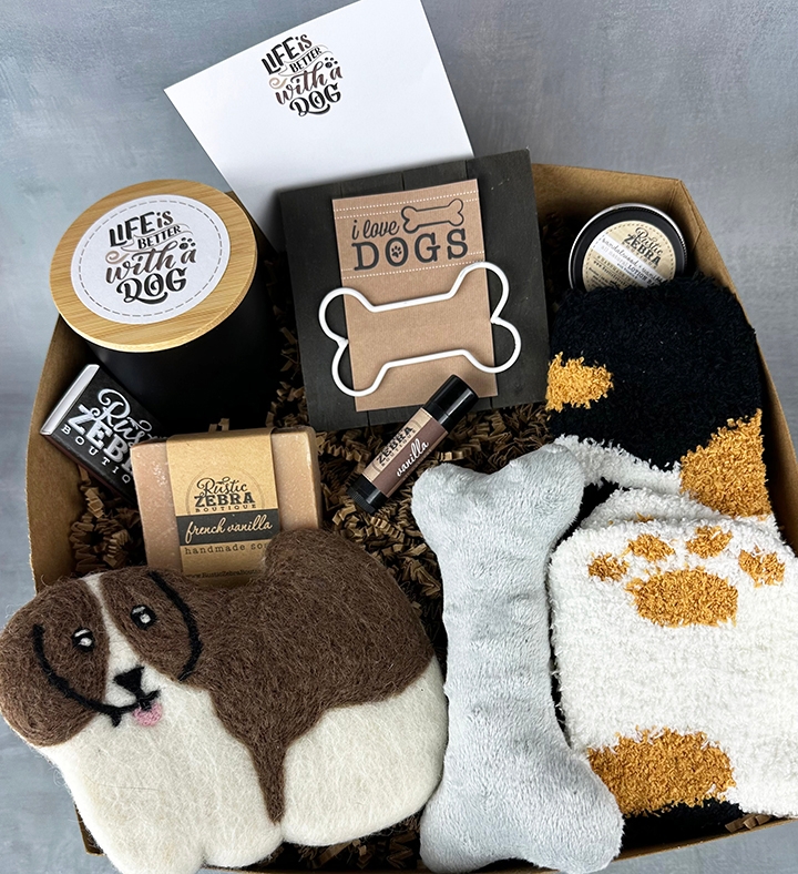 This charming dog-themed gift set includes a hand-poured soy candle in white birch scent, a custom box of matches, a dog clip frame, all-natural French vanilla soap and lip balm, a vanilla lotion bar, fluffy dog socks, a stuffed dog bone toy, and a dog felt coaster—all in assorted colors—plus a personalized greeting card. Thoughtfully assembled for pet lovers, it combines cozy comfort, playful touches, and a personal message to make any occasion special.